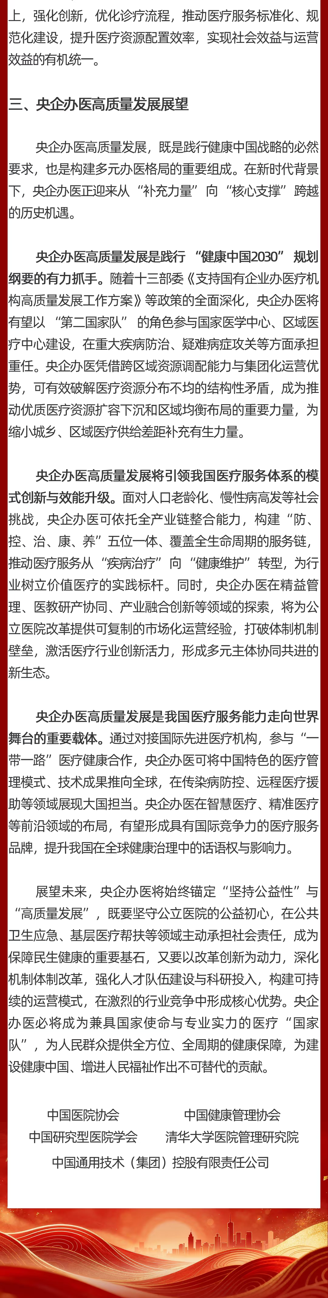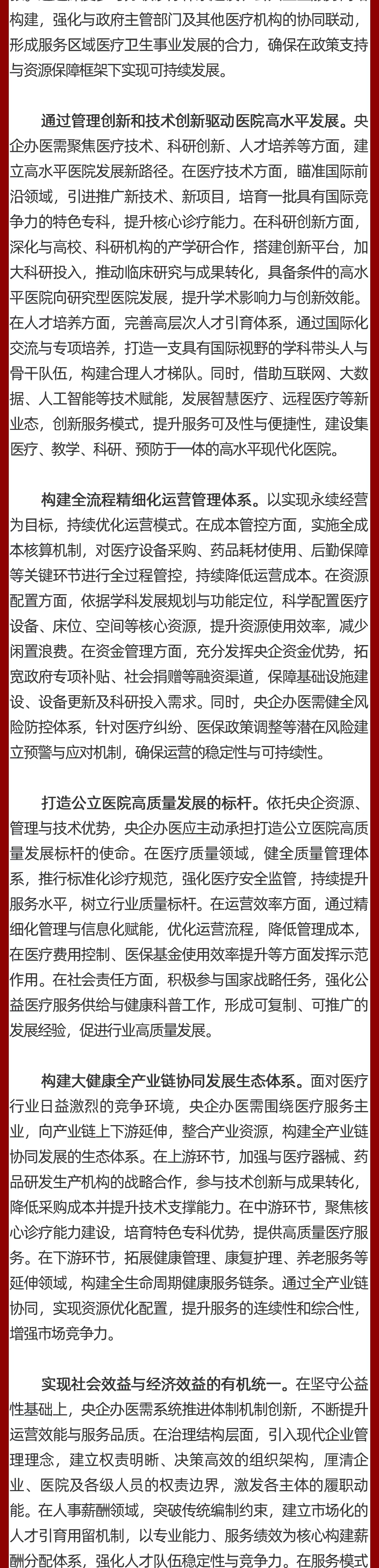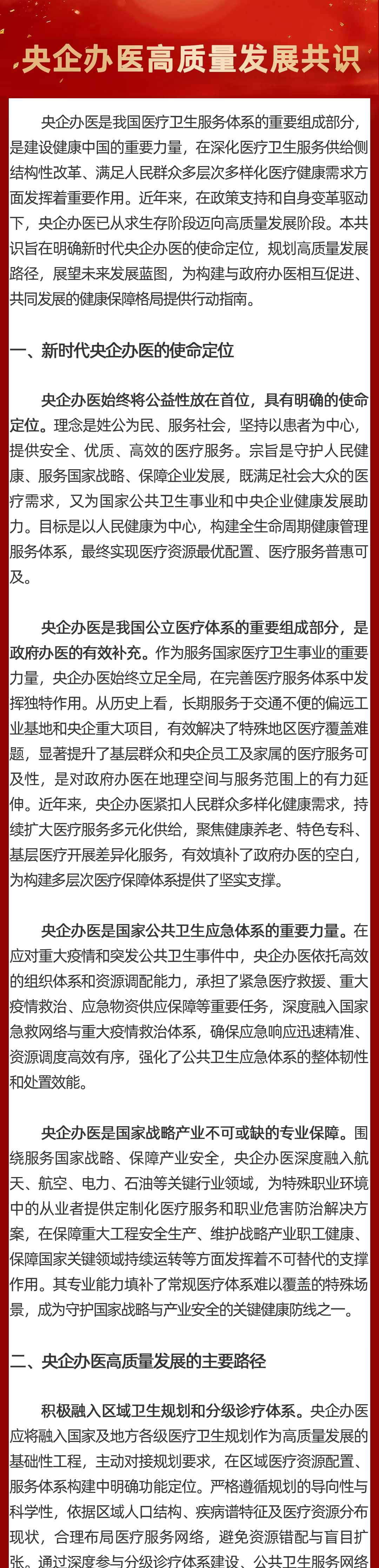現(xiàn)將《共識(shí)》全文發(fā)布如下,期待與各方攜手,共同推動(dòng)央企辦醫(yī)高質(zhì)量發(fā)展,為增進(jìn)人民健康福祉貢獻(xiàn)更大力量!